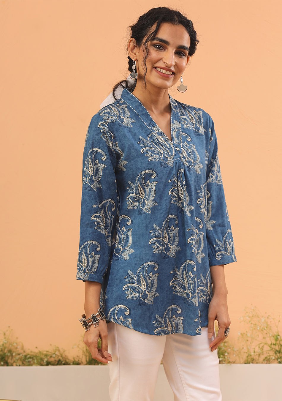 This indigo hue with intricate floral patterns offers timeless style. The pleated neckline adds a chic touch, making it ideal for casual outings, workwear, or semi-formal events with effortless elegance and comfort.