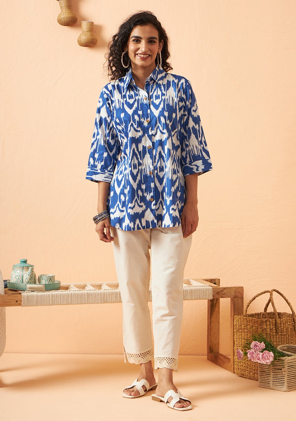 The Indigo Wave Top features a striking blue and white pattern reminiscent of ocean waves. This eye-catching design, combined with its vibrant indigo hue, makes it a standout piece perfect for adding a bold, stylish touch to any wardrobe.