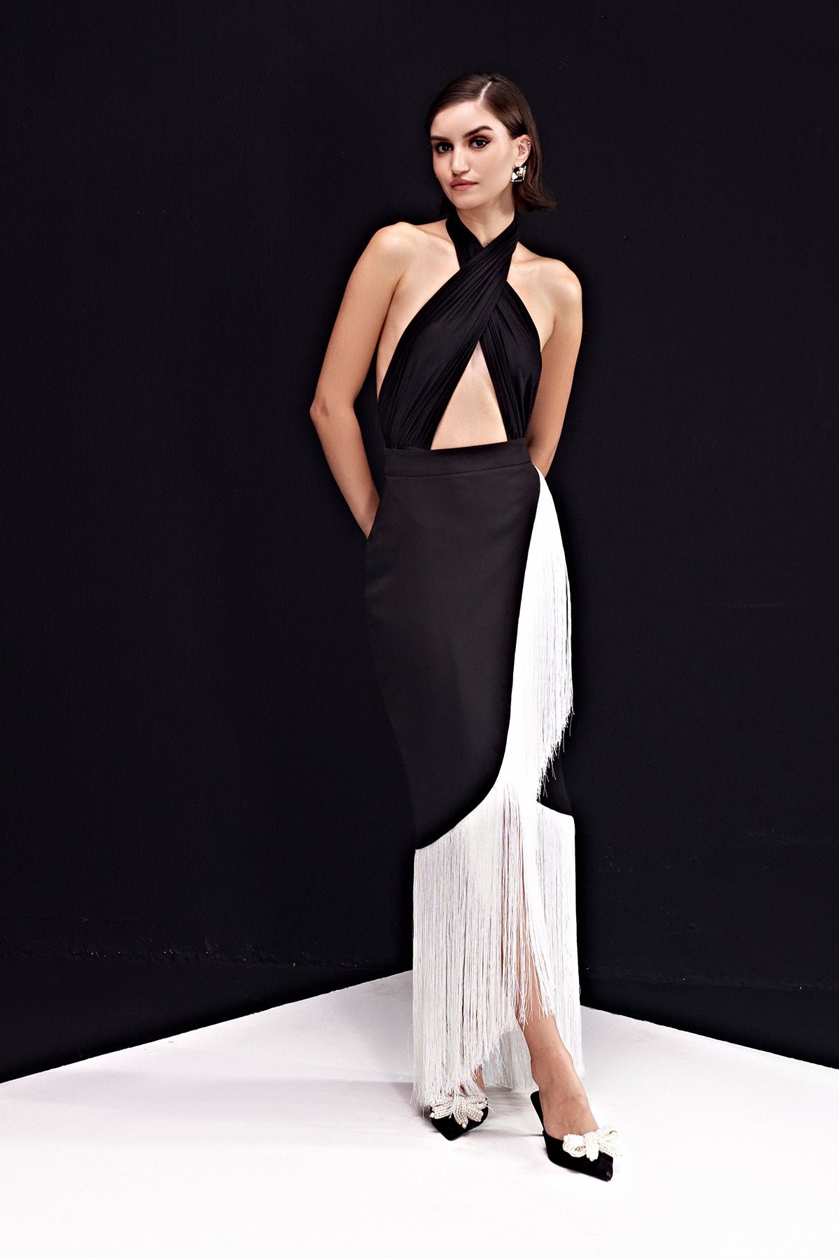 Featuring The Black Block Ivory Fringe Tassel Skirt With Cross-Neck Body Suit