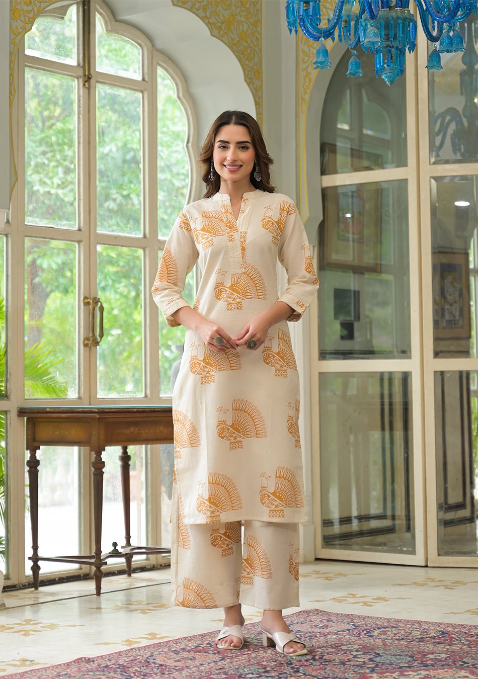Graceful and serene, this ivory Mustard co-ord Set? brings heritage to life with its printed green peacock motifs. The relaxed fit, side-slit kurta and matching straight pants make it a perfect pick for breezy, effortless elegance.