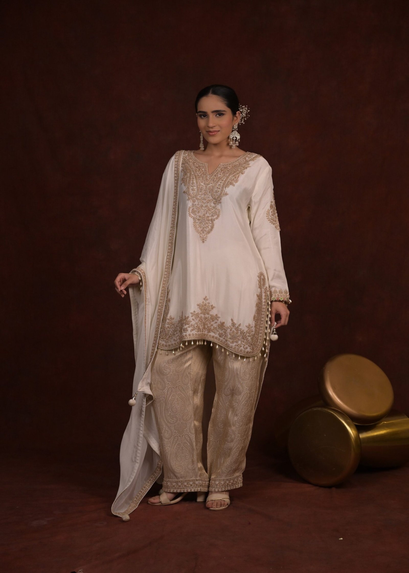 Dupatta Detail: The look is finalized with a matching ivory dupatta adorned with a detailed embroidered border. The edges are finished with delicate droplet tassels.