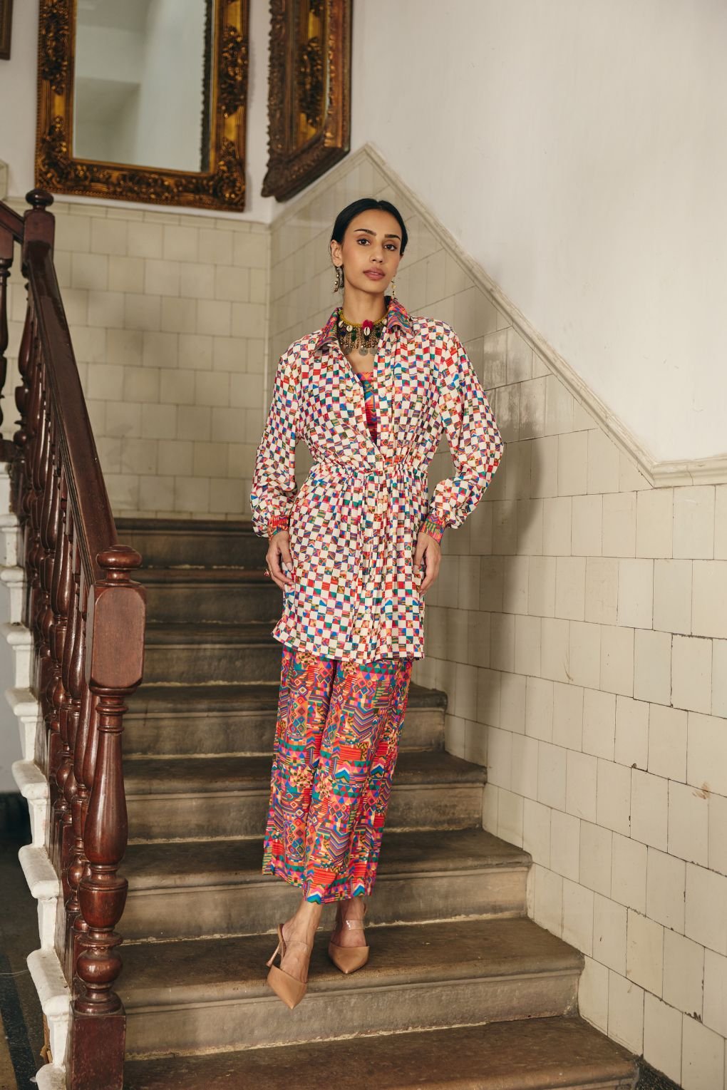 Celebrate in style with this women?s festive co-ord set, crafted in luxurious satin fabric. The long shirt features a full front opening with a classic collar and a waist cord detail, designed in an elegant abstract floral grid print for versatile styling. Layered over a ?bralette in the contrast ?print, it adds a playful, modern edge. The look is completed with straight-fit pants in a bold contrast print, featuring a sleek silhouette that balances comfort and festive charm. Together, the set creates a vibrant, coordinated outfit perfect for special occasions, while each piece can also be styled separately for endless versatility.