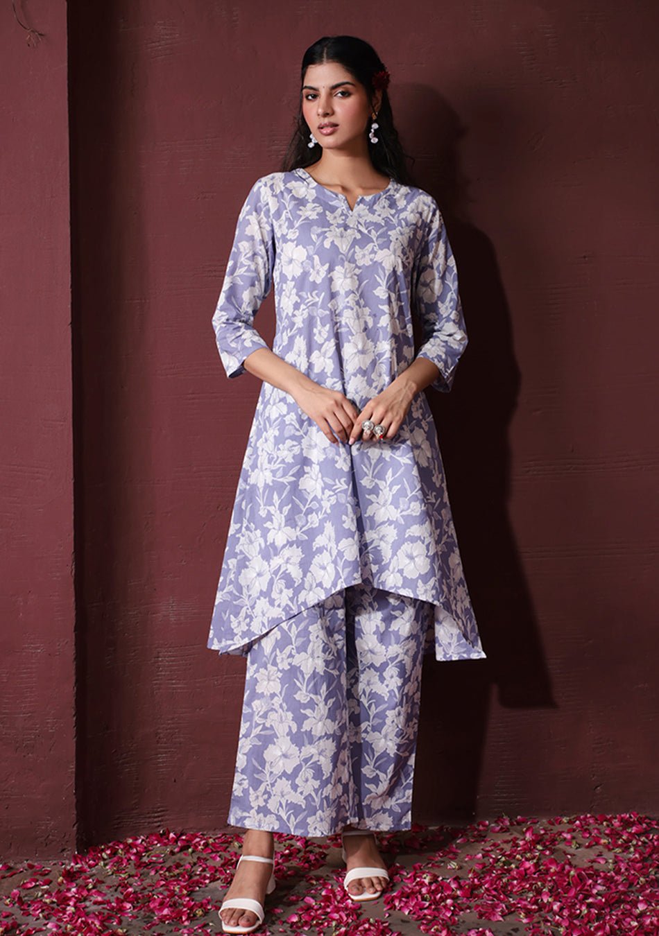 Lavender Mist Co-ord Set features a high-low purple kurta with delicate white floral prints, paired with matching wide-leg pants. Soft, breathable fabric and elegant design make it perfect for relaxed summer outings or stylish daytime gatherings with effortless charm.