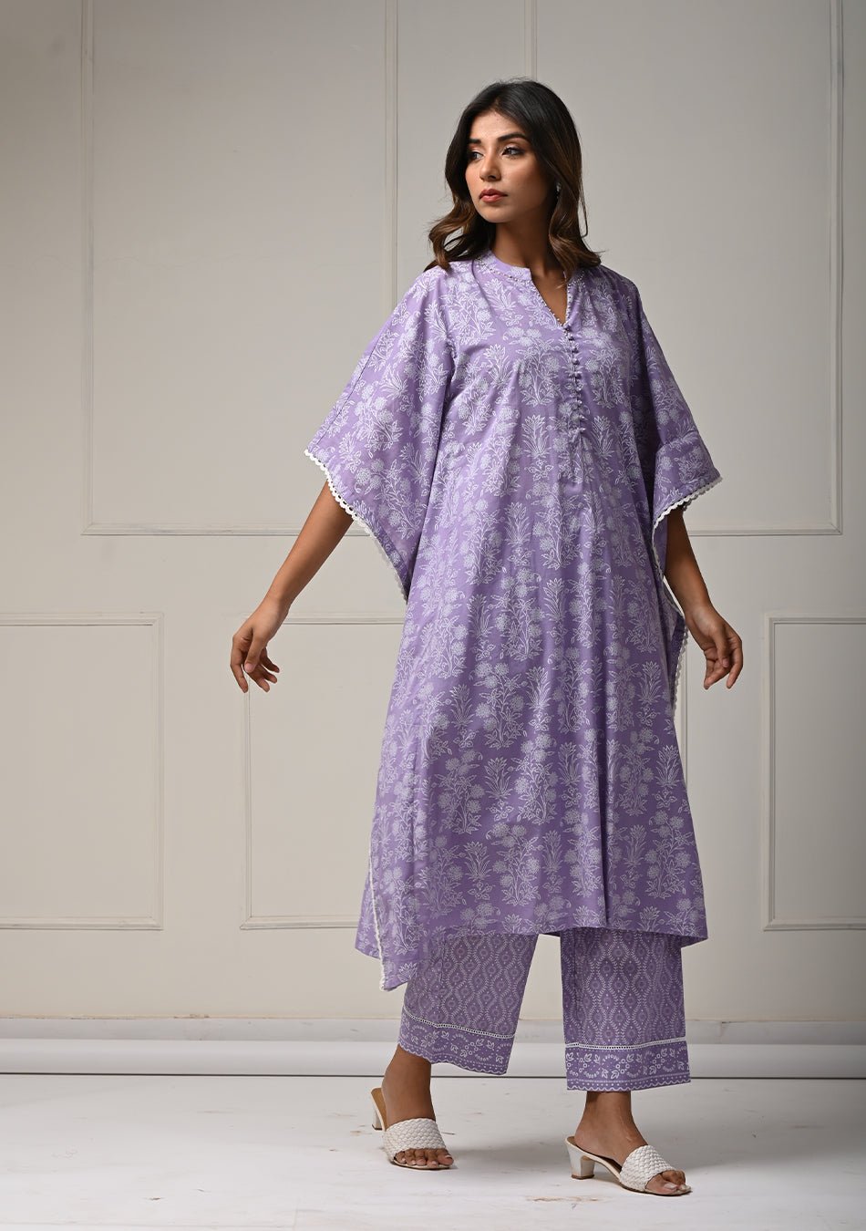 The Khadi Print Lilac Kaftan Co-ord Set is a stylish ensemble featuring a comfortable ?fabric with intricate patterns. The lilac hue adds a touch of sophistication, making it a chic and versatile outfit perfect for casual or semi-formal occasions.