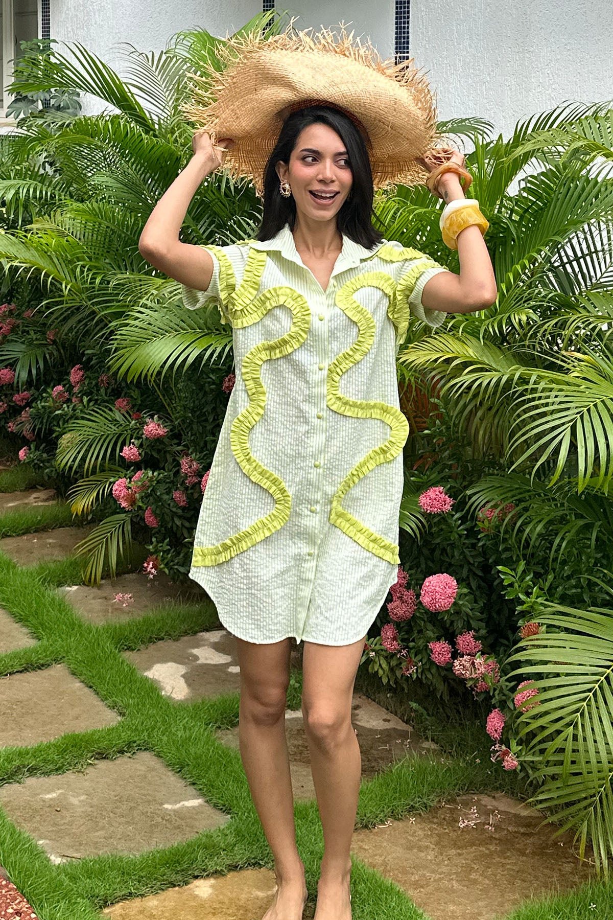 featuring the seer sucker lime shirt dress detailed with zip-zap frills?