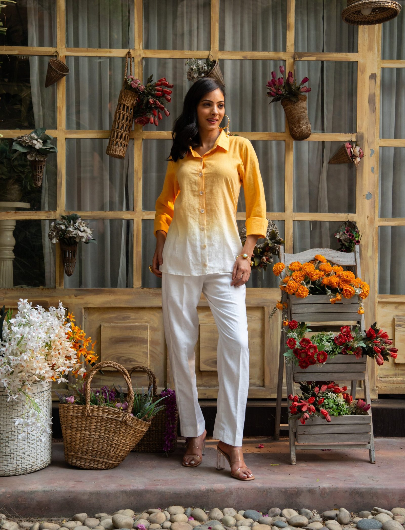 Description: Linen ombre co-ord set has a shirt collar, front button placket, regular sleeves with cuffs, and an ombre shirt paired with straight pants. ?