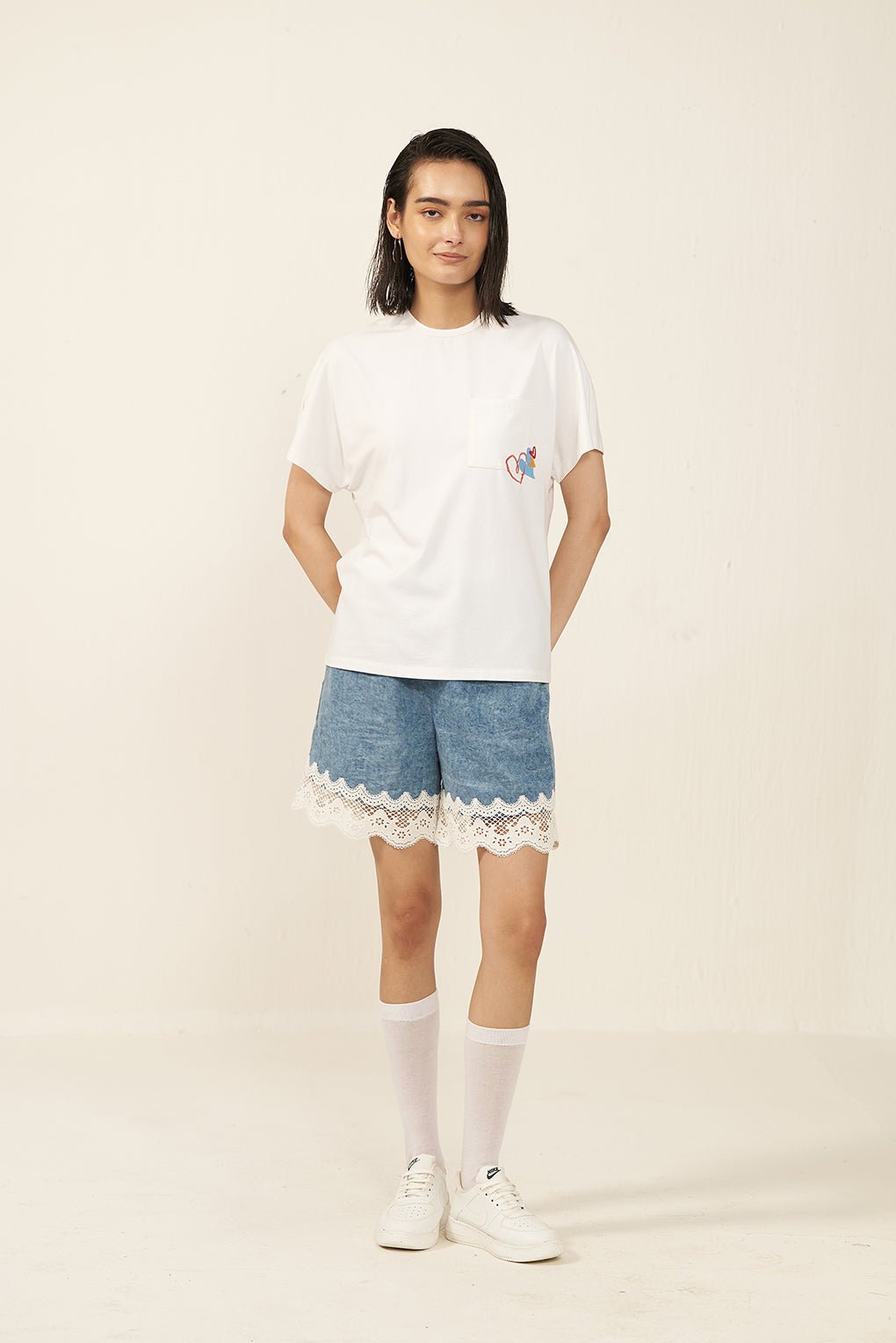 Design Detail/Trim: Tee- Embroidery & print and?Shorts – Lace at bottom with drawcord.