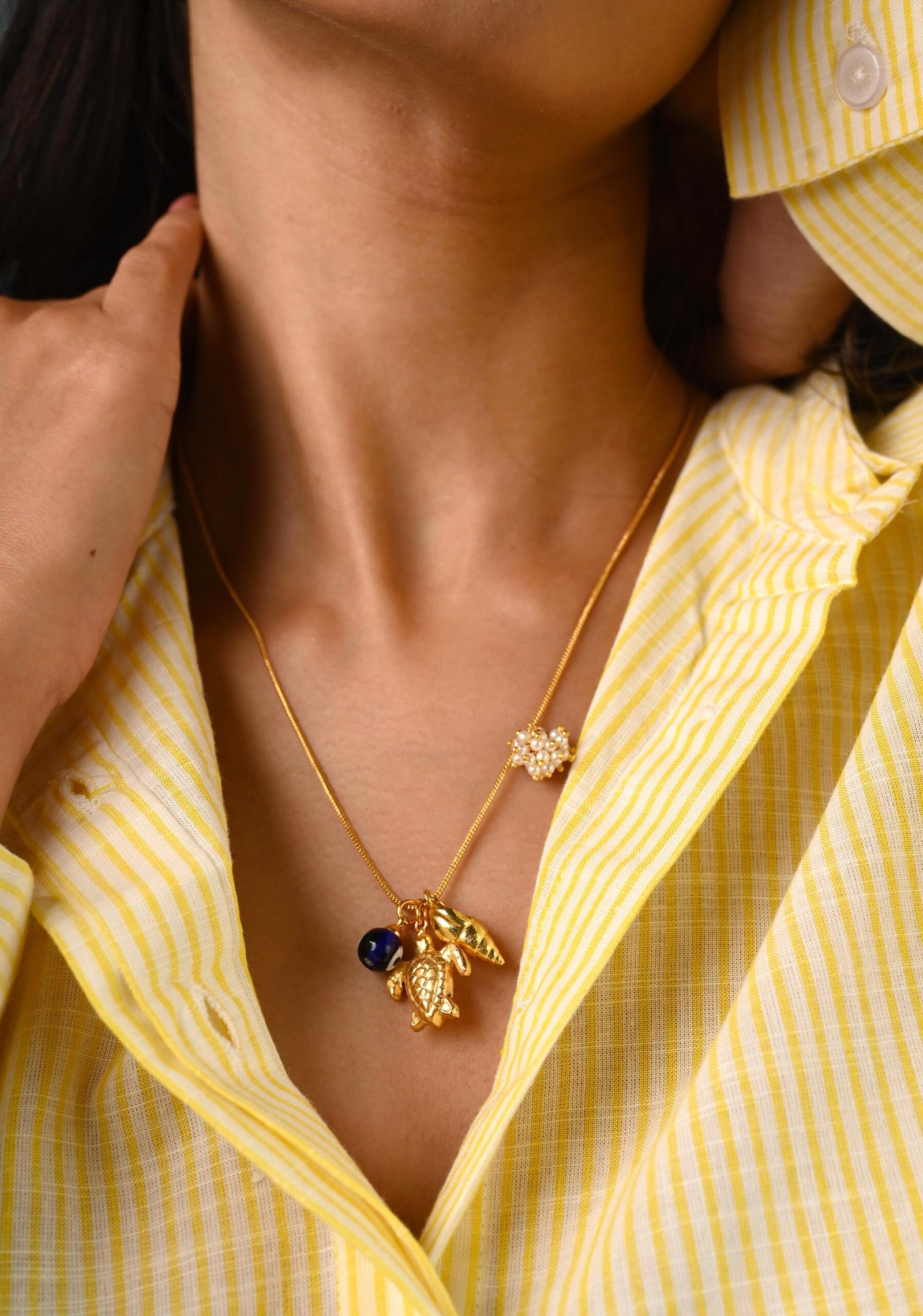 The perfect neckpiece for a beach lover! Assorted charms with evil eye and a bunch of pearls to complete the look.