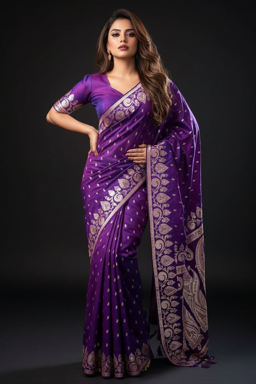 This Banarasi Silk Saree showcases silk (semi)? material and zari weaving with meenakari work all over, highlighted by stunning weaving. The luxurious and refined beautiful weaving extends to the border. The saree is complemented with traditional designs. Elevate your fashion game with this premium and classic saree.