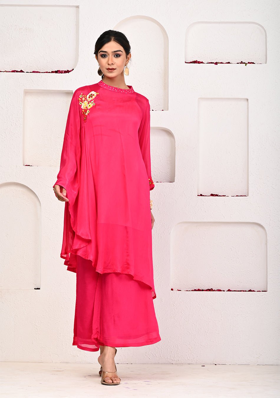 Experience the epitome of elegance in our “Magenta Bliss Kaftan Set” crafted in luxurious chinon with intricate adda work. The relaxed design, vibrant magenta hues, and detailed embroidery create a perfect blend of comfort and sophistication for any occasion.