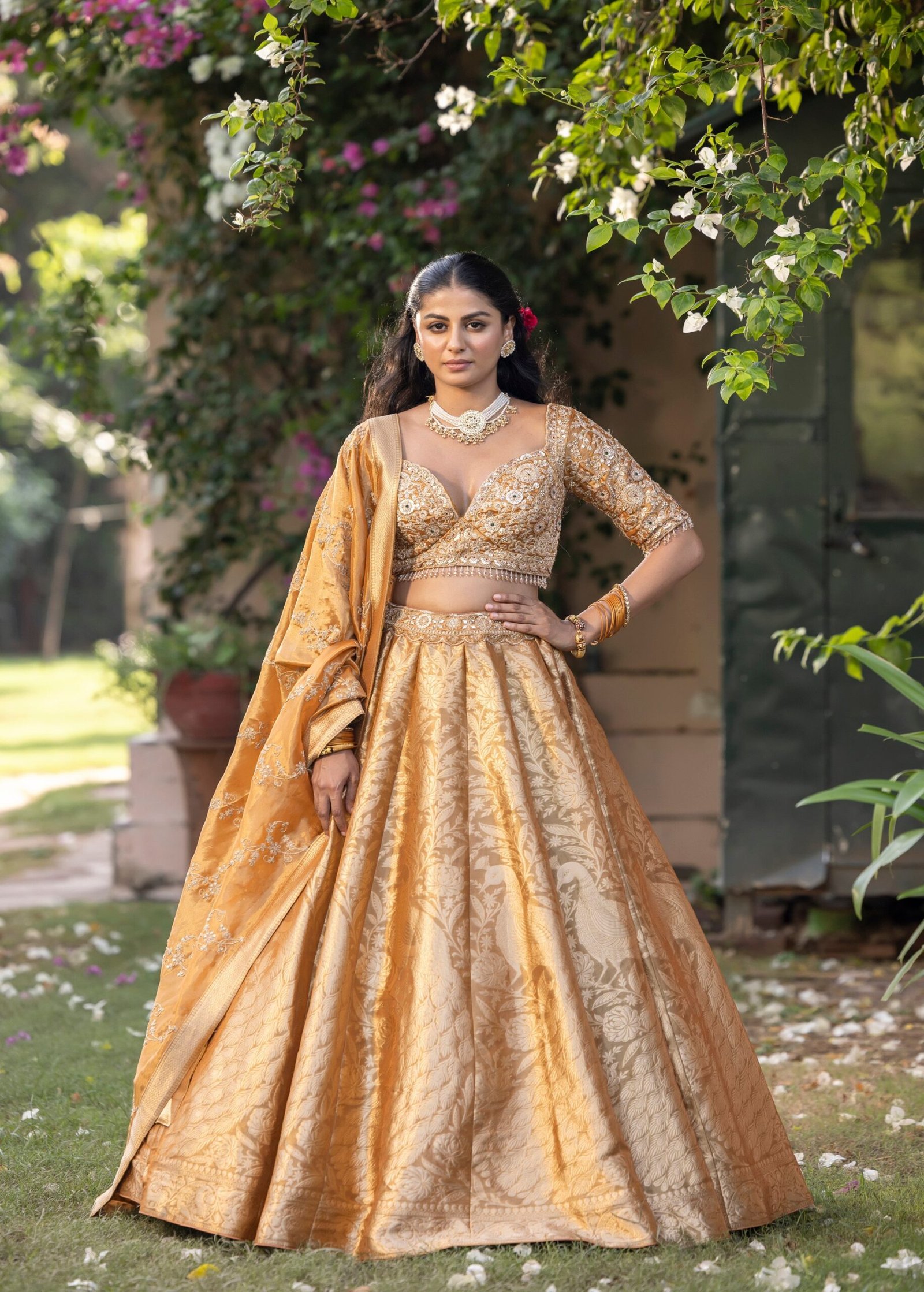 This breathtaking marigold lehenga set features a traditional three-piece silhouette, including a heavily embellished stitched blouse (38 inches with additional 2 inches margin) , a voluminous lehenga skirt, and a coordinating dupatta. This beautiful ensemble is made from rich Banarasi silk and features detailed golden thread embroidery. The design is enhanced with mirror, stone, and zarkan work, and the blouse is finished with a delicate beaded fringe for a modern, stylish touch. This lehenga showcases beautifully woven peacock motifs that symbolize grace and timeless beauty.