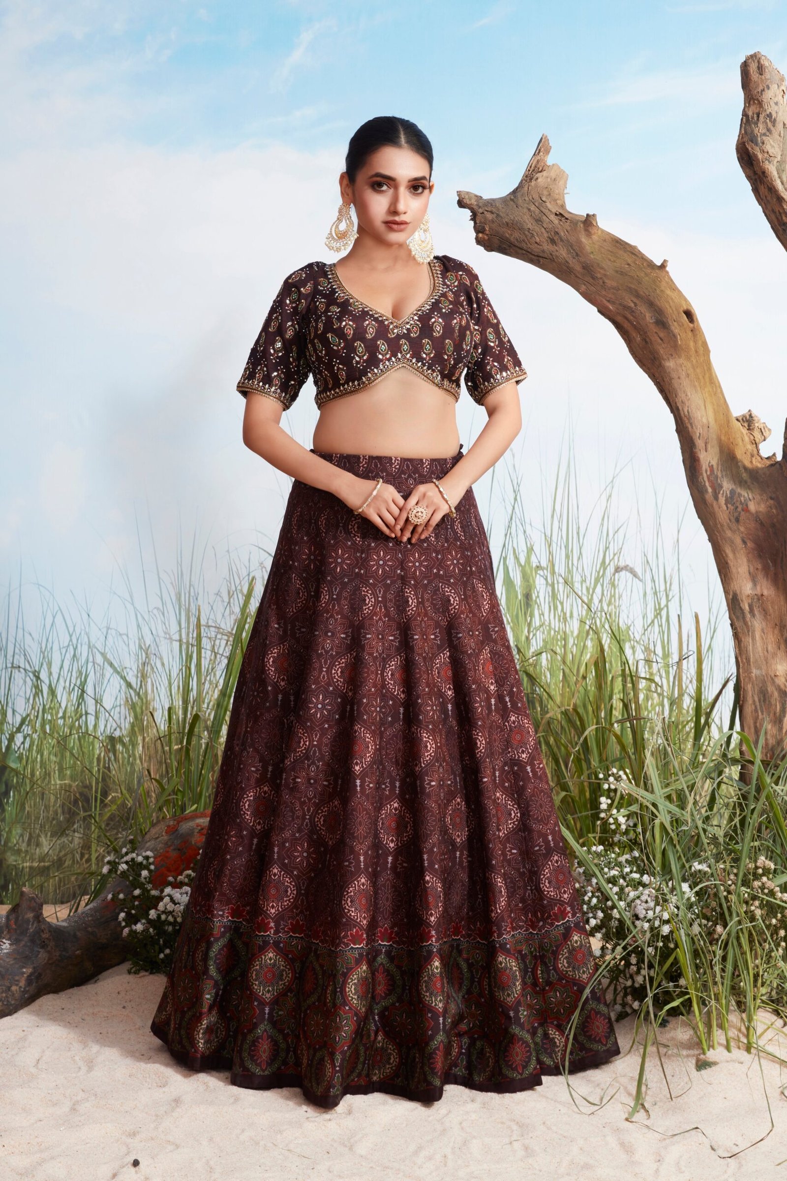 A luxurious Coffee Brown Raw Silk Lehenga Set featuring a richly printed A-line lehenga skirt with an ornamental border, paired with an elegant cropped blouse that is heavily embellished with mirrors, stones, and cut dana work along the neckline and sleeves.