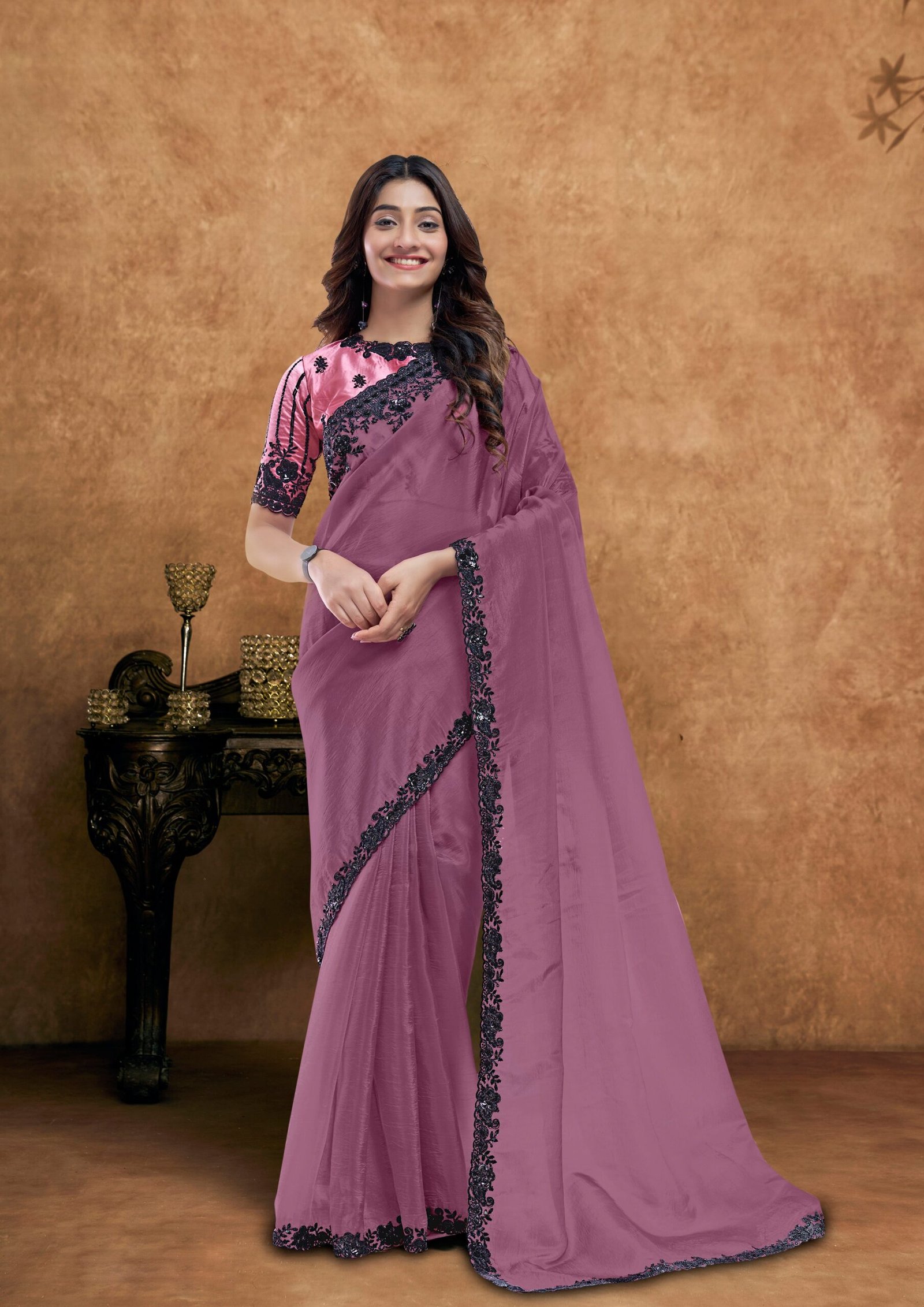 Exude effortless grace in this mauve orchid saree, featuring a delicate, fluid drape that catches the light beautifully. The ensemble is defined by a striking contrast of a black border and a matching embellished blouse, making it a sophisticated choice for evening soirees and festive celebrations.