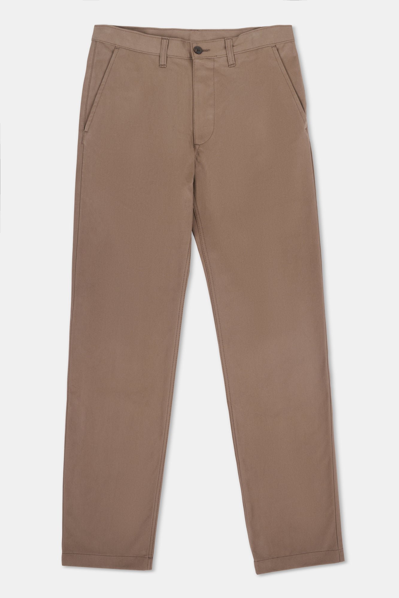 Cut with a slim leg. 295g heavyweight 100% cotton from Brisbane Moss. We do not garment wash our chinos, there may be up to 3% shrinkage after washing.?Cut and sewn in Blackburn, Lancashire.?Flat front. Zip fly and button. Two side pockets, rear pocket on right side.?