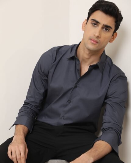 Men Dark Grey Cotton Plain Regular Fit Full Sleeve Collared Shirt