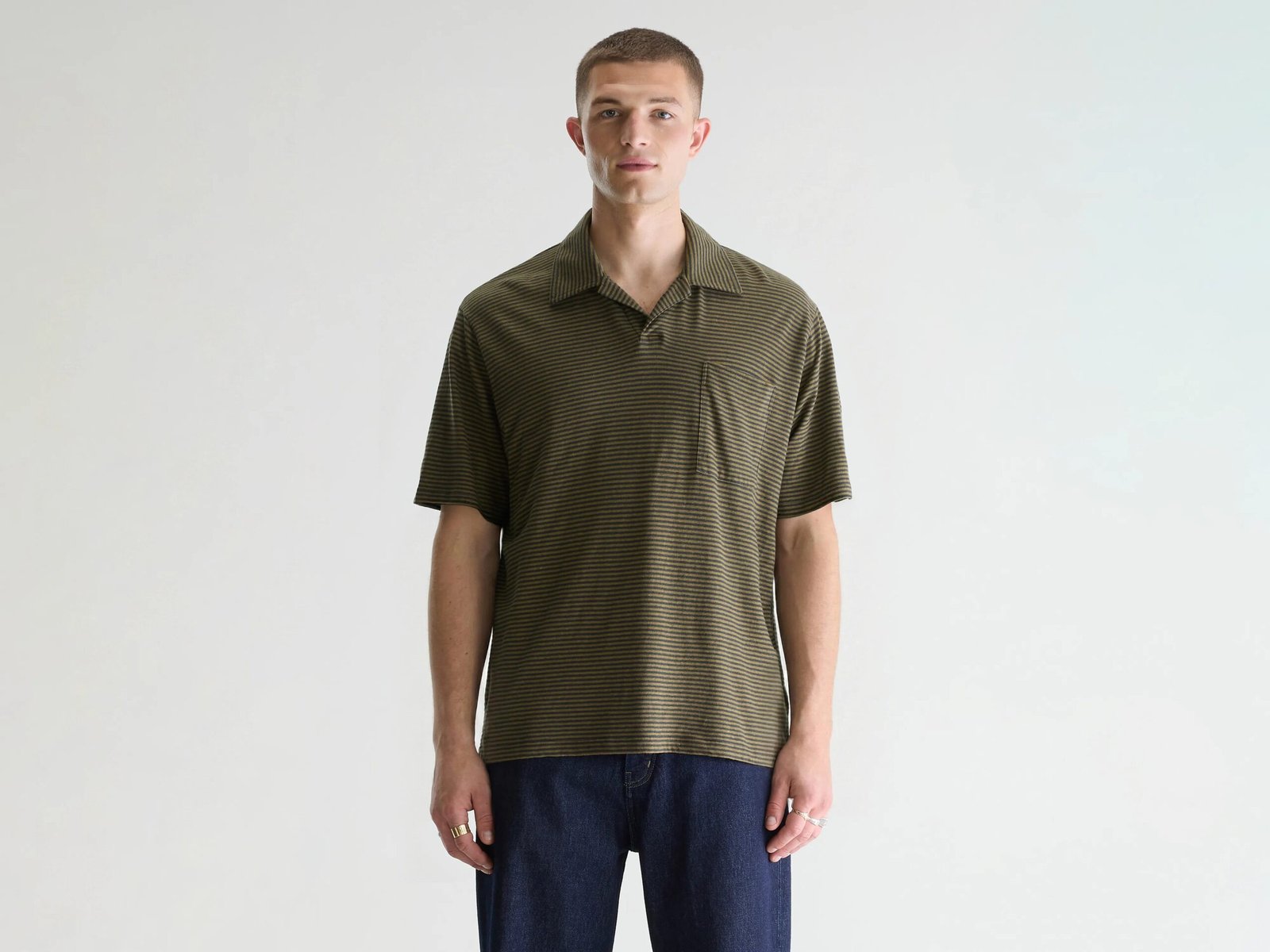 Relaxed striped polo with short sleeves and a chest pocket, made from mid-weight jersey with fine khaki and black stripes.