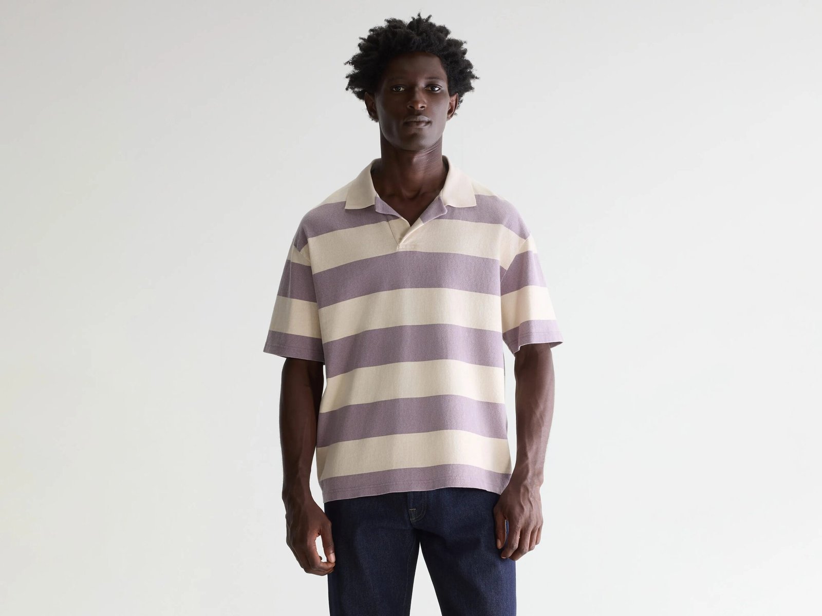 Oversized striped polo with short sleeves and a ribbed collar, made from mid-weight rustic cotton jersey with wide faded purple and beige stripes.