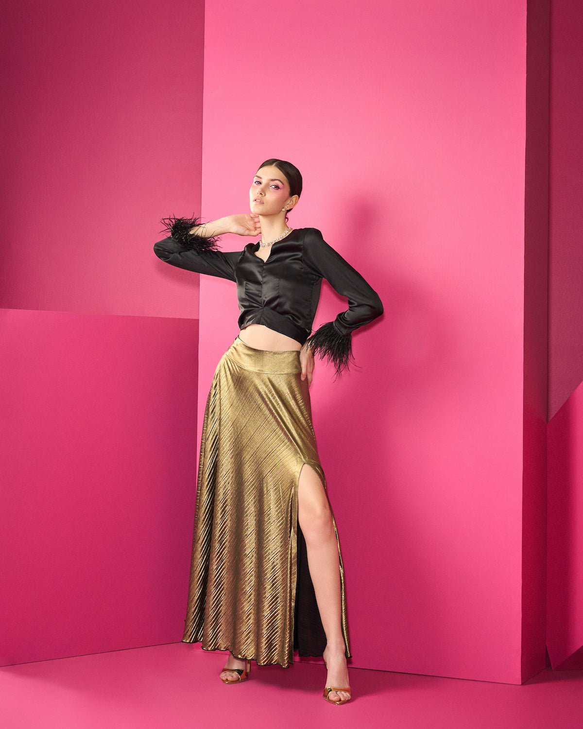 Metallic Gold Slit Skirt Co-ord Set with Black Fur Top