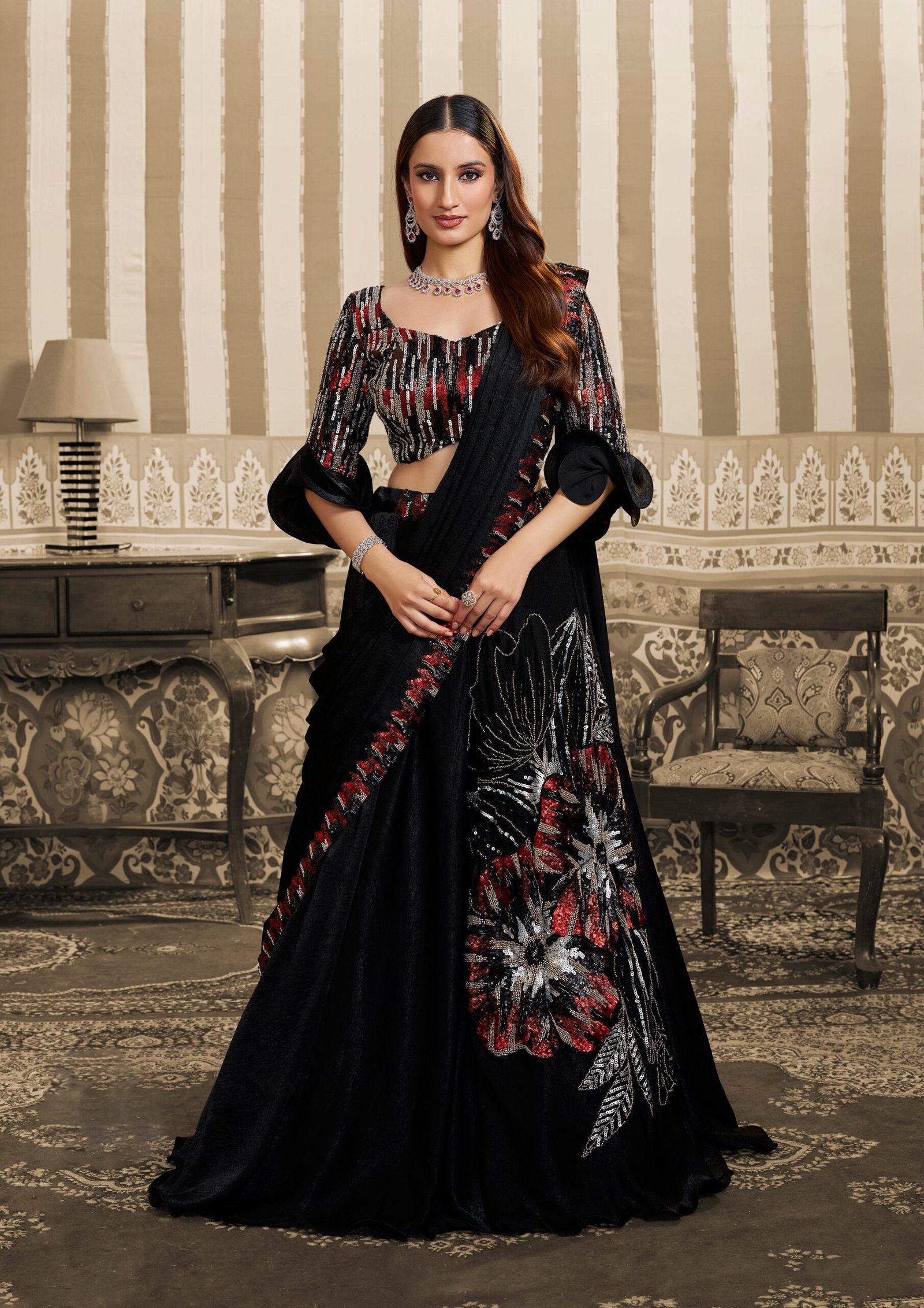 This elegant midnight black ensemble features an embellished satin silk draped saree lehenga paired with a structured blouse with ruffled sleeves (38 inches with 4-inch margins). The design showcases large floral motifs highlighted with sequins and delicate beadwork. Vertical striped cut dana detailing on the blouse adds a refined, glamorous finish, making it perfect for evening occasions.