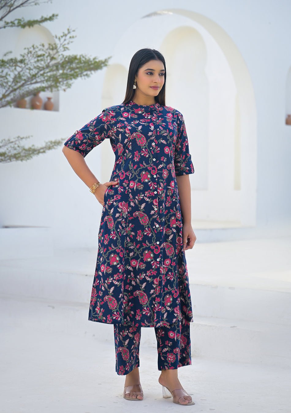 DETAILS:? Fabric: 100% premium cotton? Feel: Soft, breathable, lightweight, skin-friendly? Print: All-over floral and paisley garden print? Color: Deep midnight navy base with pink and sage motifs? Kurta Style: Straight silhouette with front button-down placket? Neck: Round neckline? Sleeves: Elbow-length sleeves? Length: Knee-length kurta? Bottom: Straight pants with relaxed fit? Waist: Elasticated waistband for all-day comfort? Season: Ideal for summer and all-season daily wear? Occasion: Office wear, casual outings, travel, day events? Fit Type: Regular comfortable fit? Care: Gentle machine wash / cold wash separately? Style