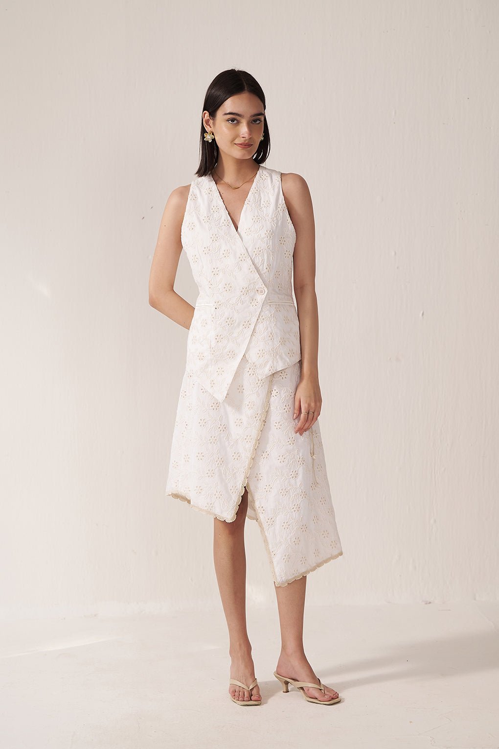 An elegant ivory lace co-ord set featuring a structured sleeveless wrap-style vest paired with a matching asymmetric lace skirt. The top is designed with a deep V-neckline and a flattering wrap silhouette, accentuated by a statement ring detail at the waist for a modern touch. The skirt showcases delicate all-over lace with soft lining and an asymmetric hem that adds graceful movement. Feminine, refined, and effortlessly chic, this set is perfect for brunches, festive gatherings, or elevated summer occasions.
