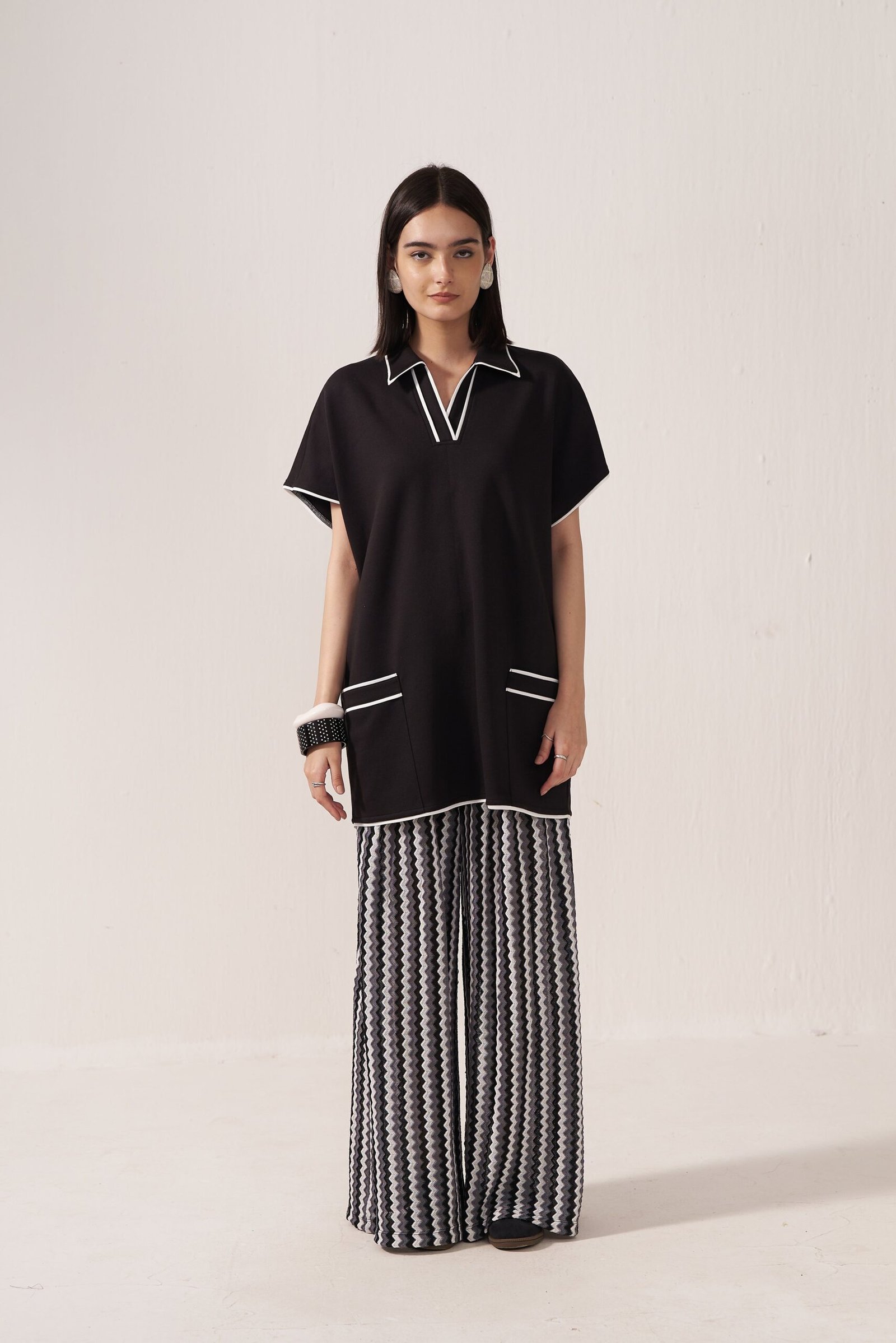 This black and white co-ord set for women pairs a structured tunic-style top with high-waisted geometric print pants for a bold monochrome statement. The black tunic features contrast white piping along the collar, sleeves, and pockets, finished with a modern V-neckline and relaxed silhouette for effortless structure. The high-waisted straight-leg pants showcase a striking black and white geometric pattern, adding movement and a contemporary edge to the look. Designed for modern workwear, smart casual outings, and elevated day dressing, this statement two-piece set balances graphic detail with clean tailoring.