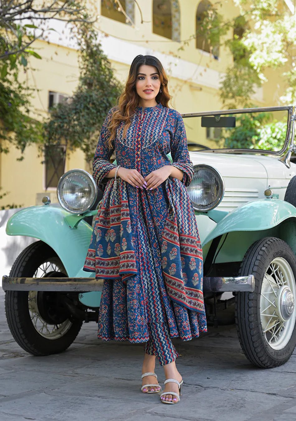 Blue Floral Pure Cotton Anarkali Suit with Dupatta