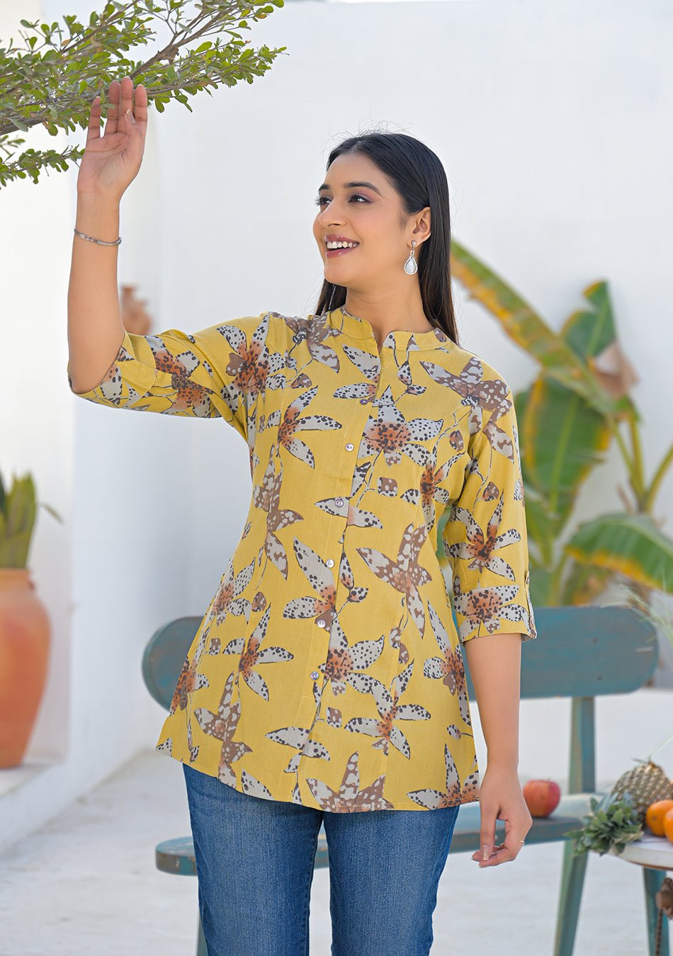 mustard botanical print top crafted in soft, breathable rayon with a relaxed straight silhouette. Featuring a mandarin collar, button placket, and three-quarter sleeves, it offers lightweight comfort and effortless style, perfect for office wear, travel days, and everyday casual dressing.