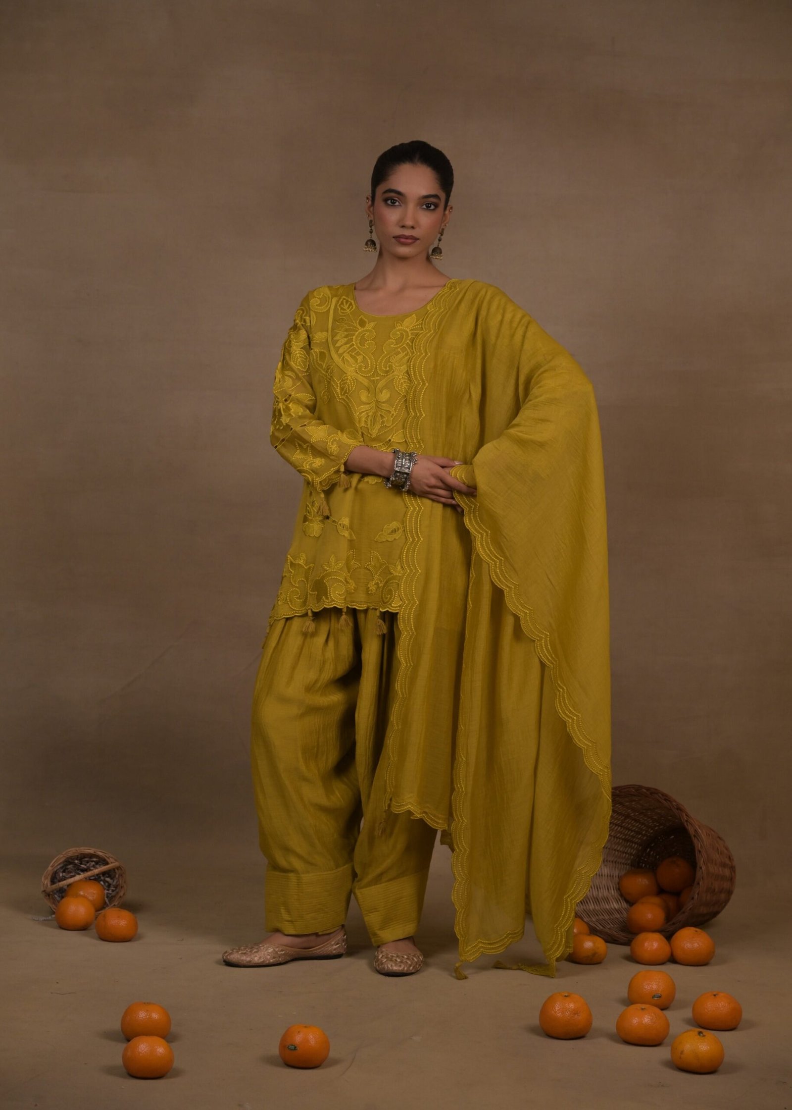 Kurta Detail: This ensemble features a short, breezy kurta designed for effortless elegance. The bodice and sleeves are adorned with tonal thread embroidery and precision cutwork, showcasing tapestry of floral and vine motifs. The hemline is uniquely finished with?small hanging tassels, adding a playful movement to the relaxed silhouette.