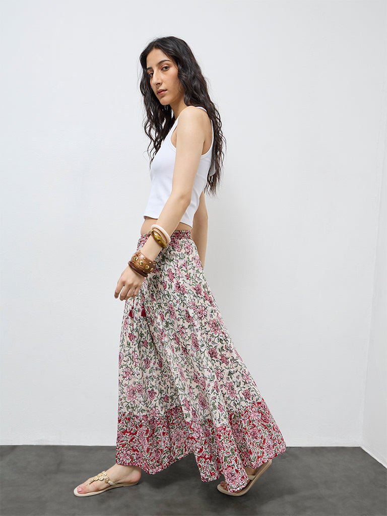 presents this off-white and pink floral printed cotton skirt designed with a soft fit and flare silhouette. An elasticated waistband with adjustable drawstrings ensures a flexible fit. Crafted from breathable cotton, the lightweight construction and gentle drape make it a summer ready piece with a fresh, feminine appeal.