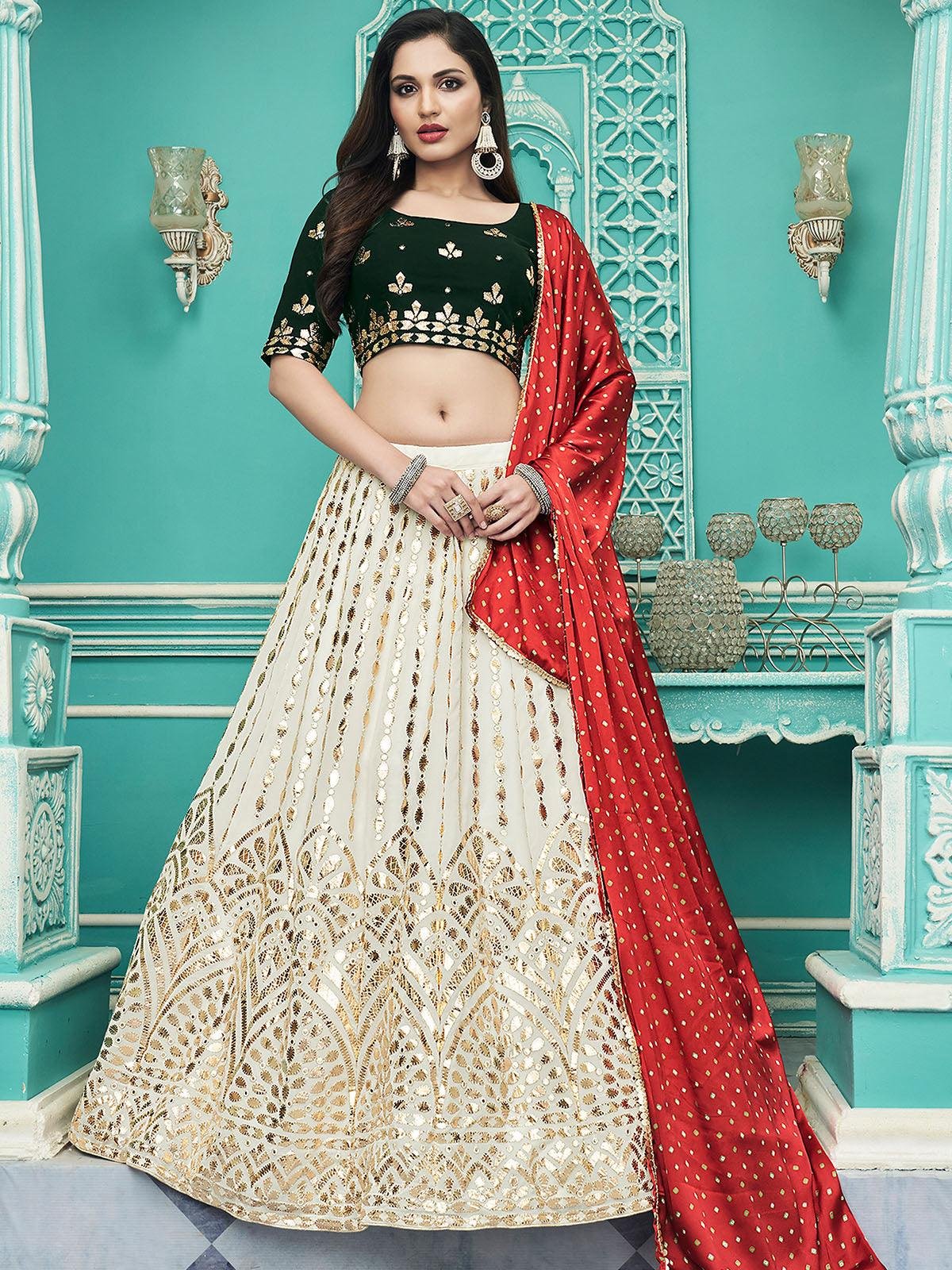 This beautiful Georgette Lehenga, Choli and Silk Dupatta set is your passport to limelight. The designer Lehenga, Choli and Dupatta set is beautified with Thread with Gota Patti Embroidery and is the perfect festive ensemble. Go for it girl.