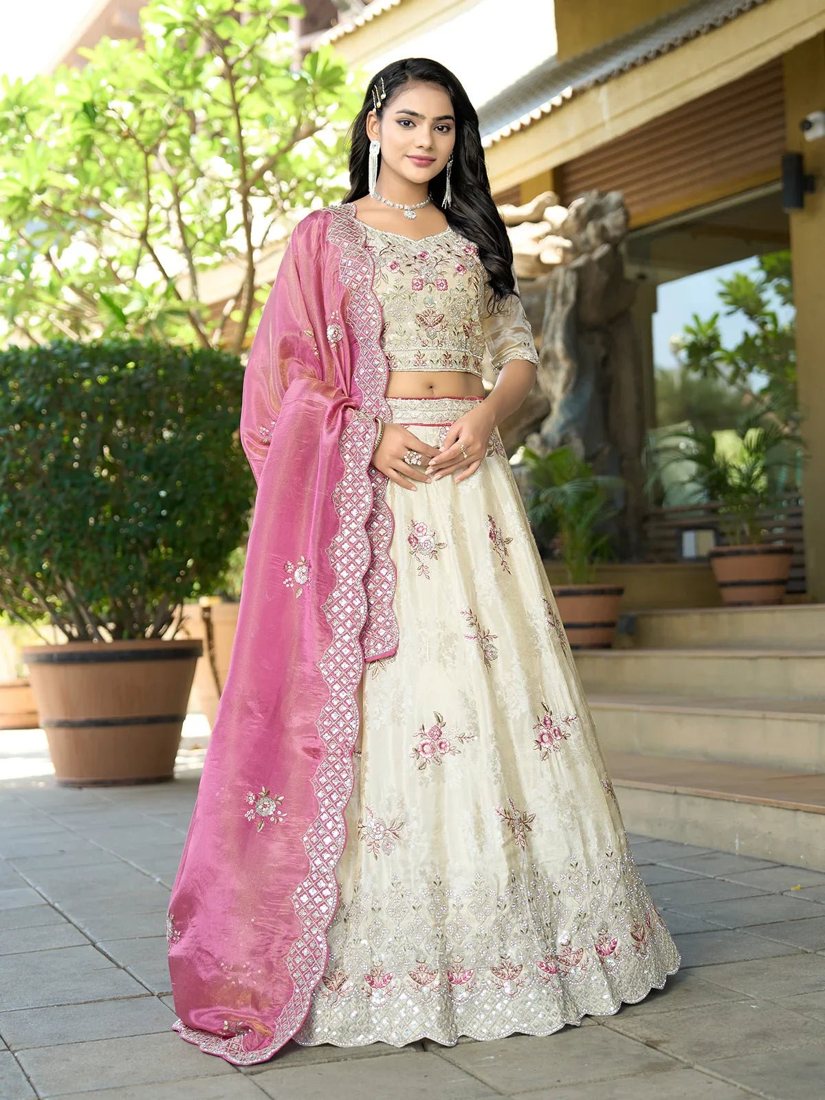Elevate your bridal charm with our Off White Jacquard Lehenga Choli, expertly crafted for timeless elegance. The lehenga and blouse are tailored from premium jacquard fabric, adorned with intricate Zarkan and sequin work that catches the light with every graceful move. The luxurious viscose dupatta adds a flowing silhouette, completing your ensemble with a modern royal touch. Ideal for brides and wedding guests, this lehenga radiates sophistication for grand occasions like weddings, receptions, and festive gatherings.