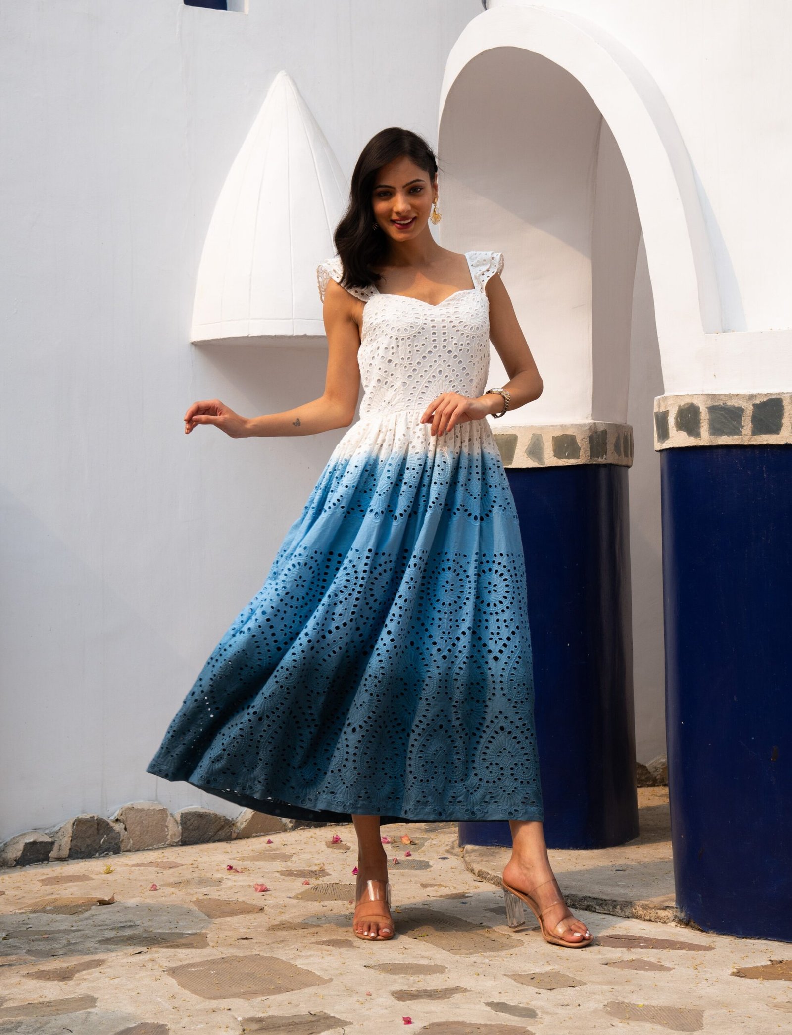 Description: Ombre Hakoba maxi dress featuring a sweetheart neckline, double-layered flared straps, gathered attached skirt, flared dress. ?