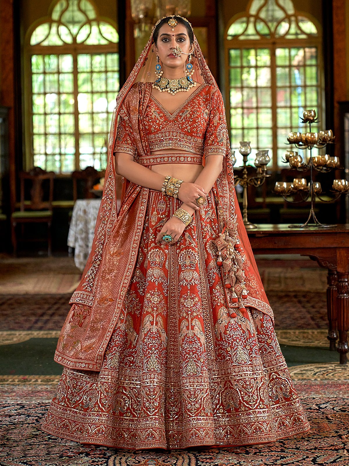 Orange Silk Embroidered Wedding Bridal Lehenga Choli