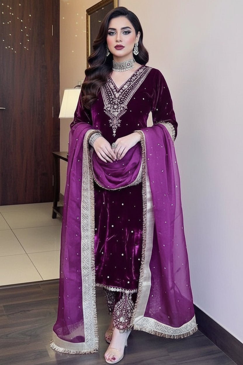 Experience the thrill of endless possibilities with our Extra Glitz Of Party- Designer Suit Set! Made from luxurious viscose Velvet and featuring Sequins & zari embroidery work, this set will elevate your style to new heights. The soft and lightweight fabric makes it easy to carry, while the glossy finish and dynamic look add a touch of trendiness. Dare to stand out with our bold and daring collection!