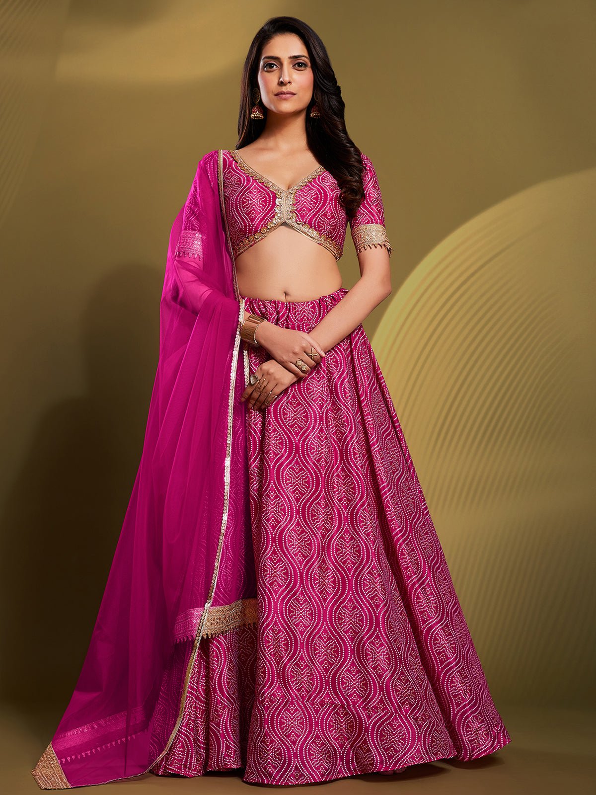 Grab This Party wear Heavy Designer Lehenga Choli And Dupatta In Fine Color Fabricated On Crepe Beautified Bandhani Work. Pair It With Matching Jewelry, Heels And A Big Smile For The Gorgeous Look.
