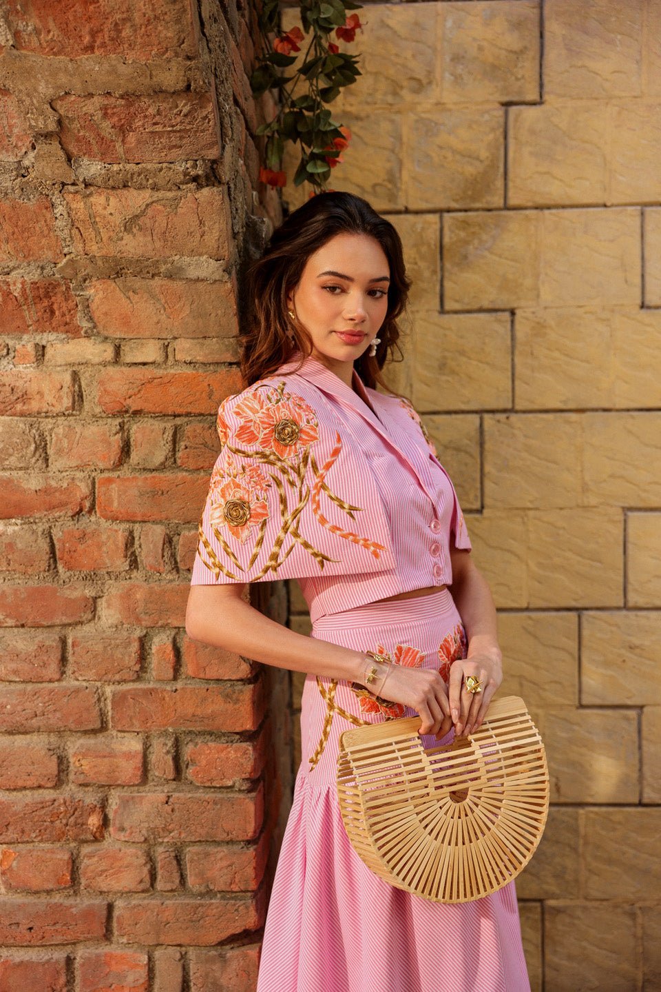 Featuring the seer sucker cotton stripe pink bolero crop jacket with threadwork embroidery paired with comfort skirt.