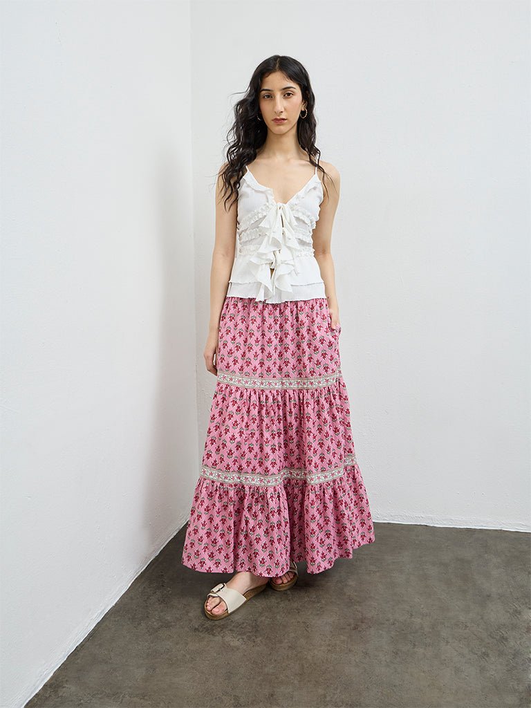 Pink Floral Pattern Cotton Maxi Skirt