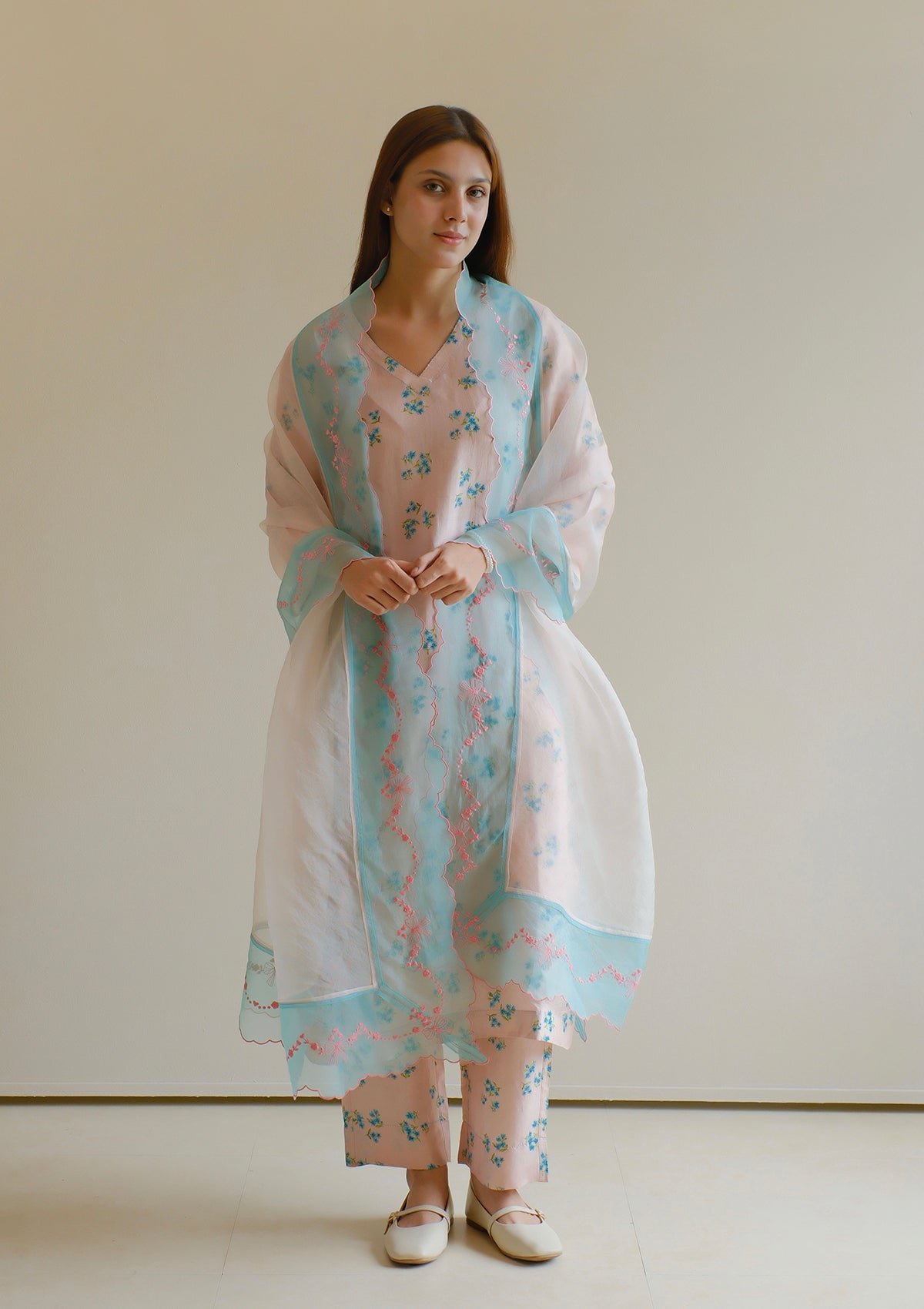 The v-neck kurta features a hand-painted Aster floral print ? each delicate bloom adding a whisper of natural beauty and femininity. Fine beadwork along the neckline and sleeves lends a subtle, glistening charm. Complementing the kurta is a pair of matching printed silk pants.