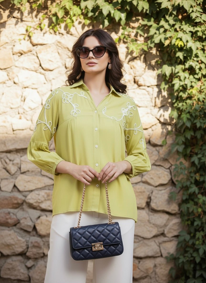 This Pista Embroidered Crepe Shirt features elegant threadwork on the shoulders and sleeves, full sleeves with gathered cuffs, and a smart button-down design for a chic, contemporary look.