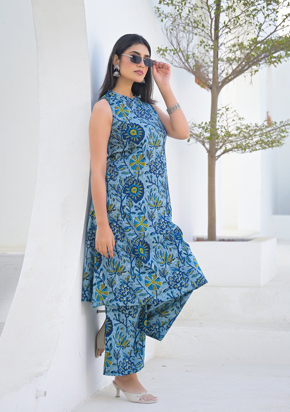 ? Fabric: Premium rayon, lightweight, breathable with a smooth, flowy drape? Color: Powder blue base with navy, mustard and teal floral vine print? Set Includes: 2-piece set ? sleeveless kurta top and matching pants? Print: All-over botanical floral and vine motifs? Technique: Screen printed? Top Silhouette: Straight A-line fit with side slits for easy movement? Length: Knee-length kurta? Neckline: Round neckline for a clean, modern finish? Sleeves: Sleeveless design for maximum summer comfort? Bottom: Relaxed wide-leg pants with soft elasticated waistband? Feel: Cool, soft and airy for all-day wear? Occasion: Casual outings, brunch, travel, vacation, resort wear? Styling Tip: Pair with flats or sandals and minimal jewellery for a fresh daytime look? Season: Ideal for summer and warm weather? Wash Care: Gentle hand wash or machine wash separately, dry in shade