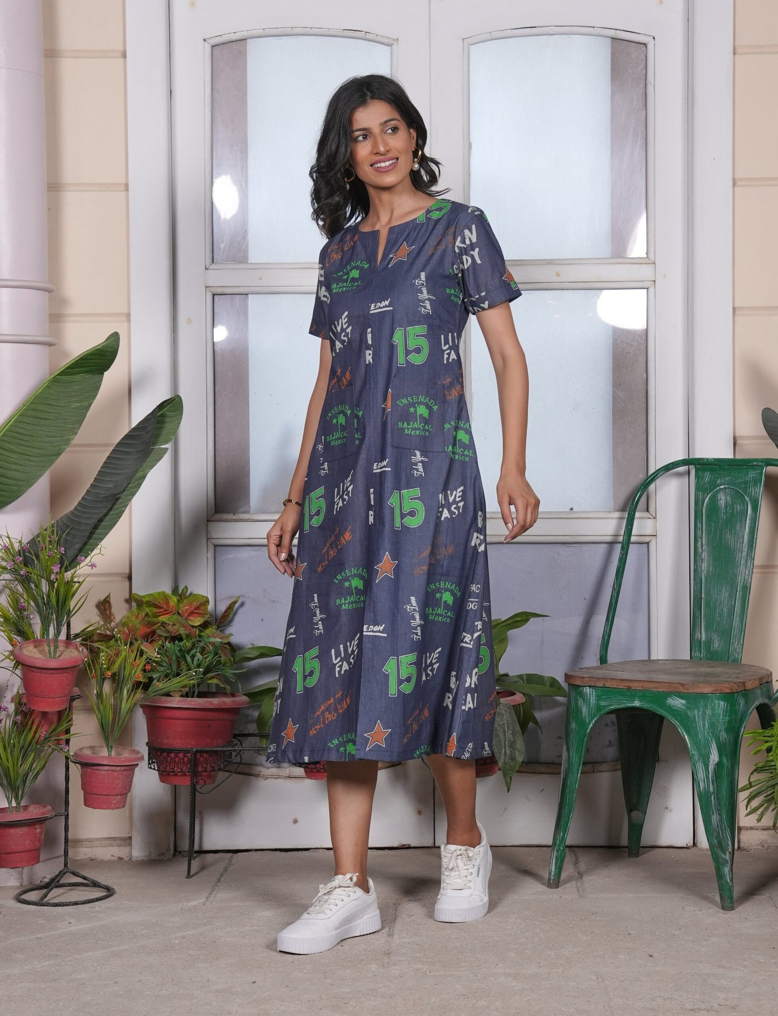 Casual midi dress with round neck, elbow sleeves, and front side pockets. designed with a relaxed fit and street-style graphic prints in bold green and white on a deep blue base. this dress combines comfort and style, making it perfect for everyday wear.