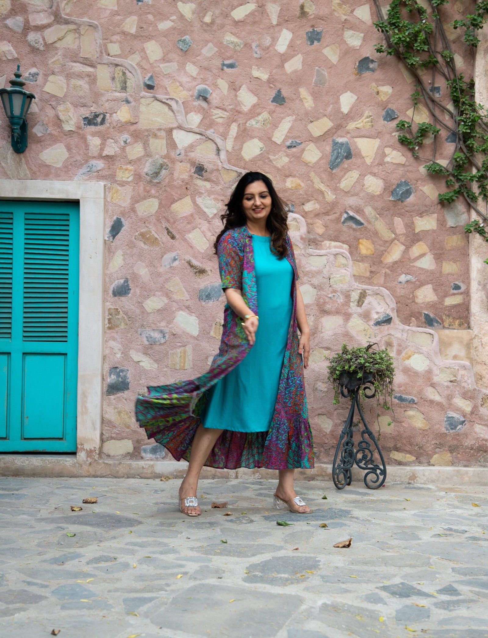 Description: Printed ruffle shrug dress with a Mandarin collar, elbow sleeves, ruffle hemline, paired with a tunic. ?