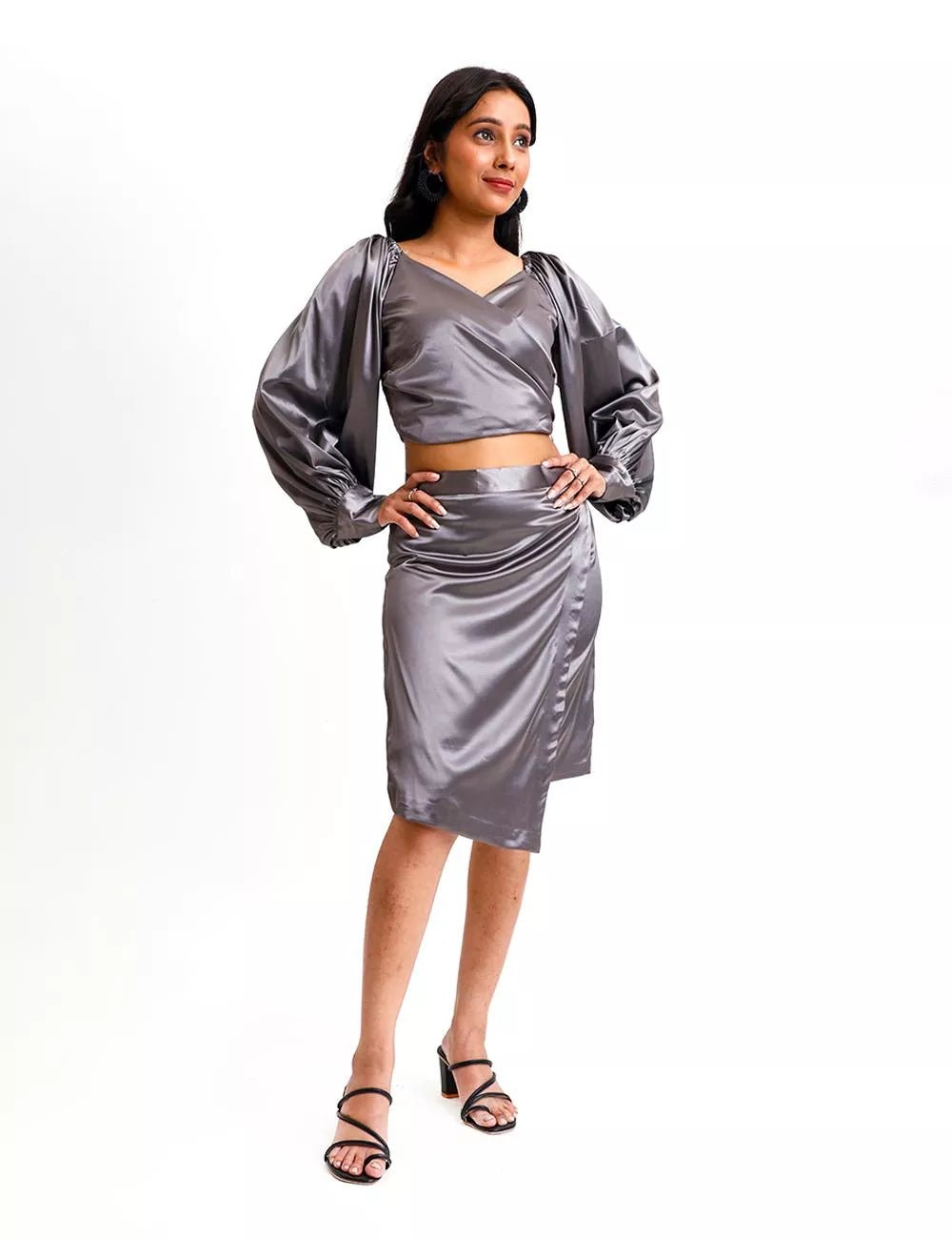 Crafted from premium-quality Satin fabric, this set embraces your body with a luxurious feel and a lustrous sheen. The elegant Grey color complements a wide range of skin tones, making it a versatile addition to your wardrobe. The short length of the top and skirt adds a playful and youthful touch to your overall look, perfect for a party atmosphere.