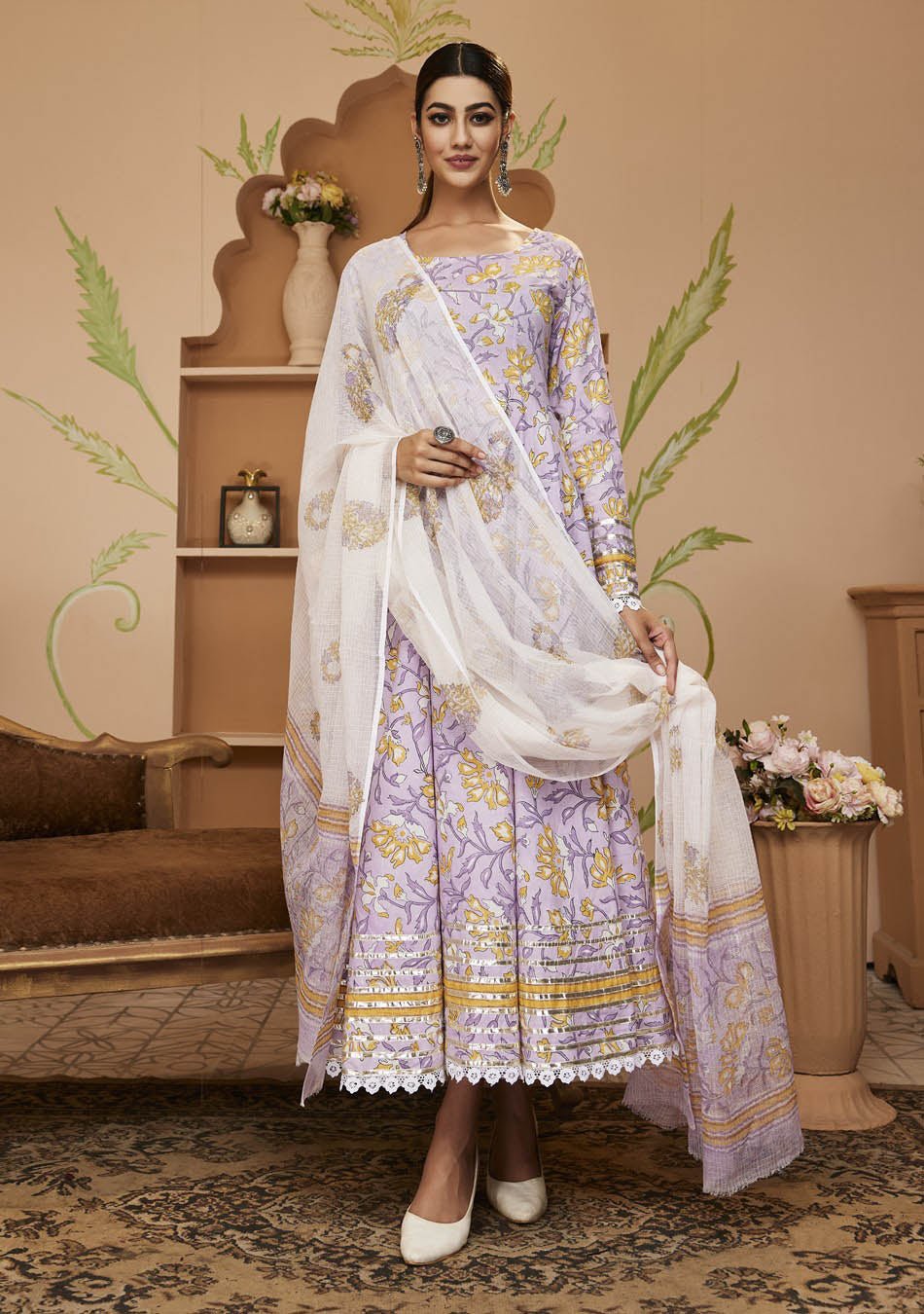 Feel the freshness of this Handblock print cotton Anarkali kurta with Trouser set with a dupatta, it has a Round neck covered with gota patti work and also covered the bottom of flared Kurta with trouser in a Handblock print. Kota Dori Dupatta looks gorgeous for that exclusive look or just go simple and stunning, keeping the look as it is. Mix and match with your favorite colors and you will always look like an ethereal diva in this purple white beauty.