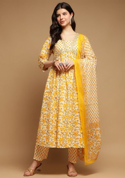 White Yellow Floral Cotton Anarkali Kurta Pant Set with Dupatta