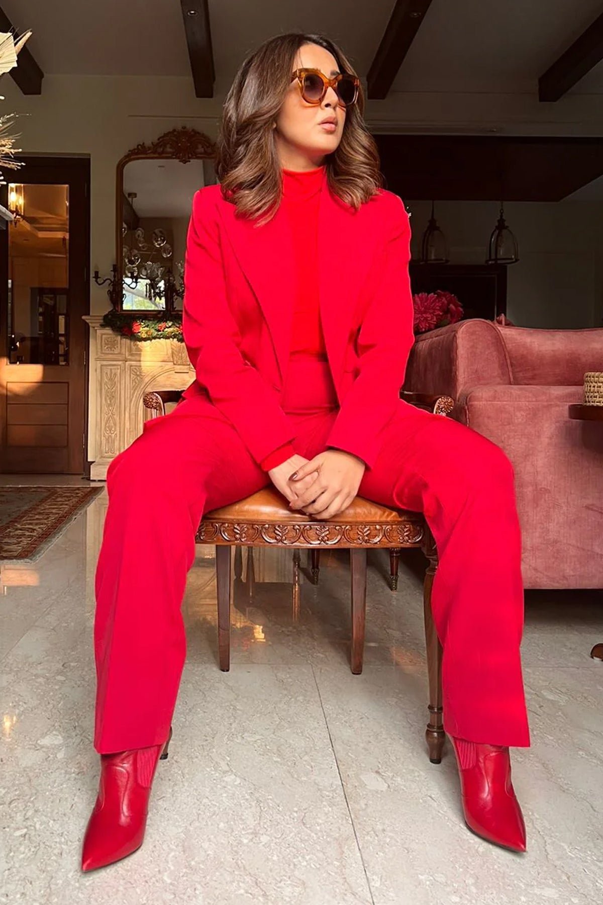 Home Co-ord set Red Power Suit High Neck Set|Bold Formal Outfit