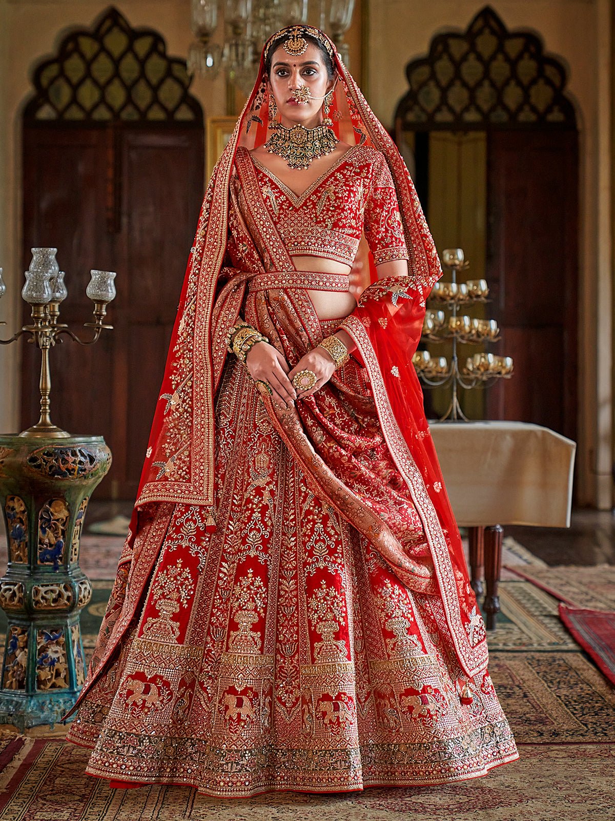 Red Silk Bridal Lehenga Choli with Dual Dupatta Embroidery