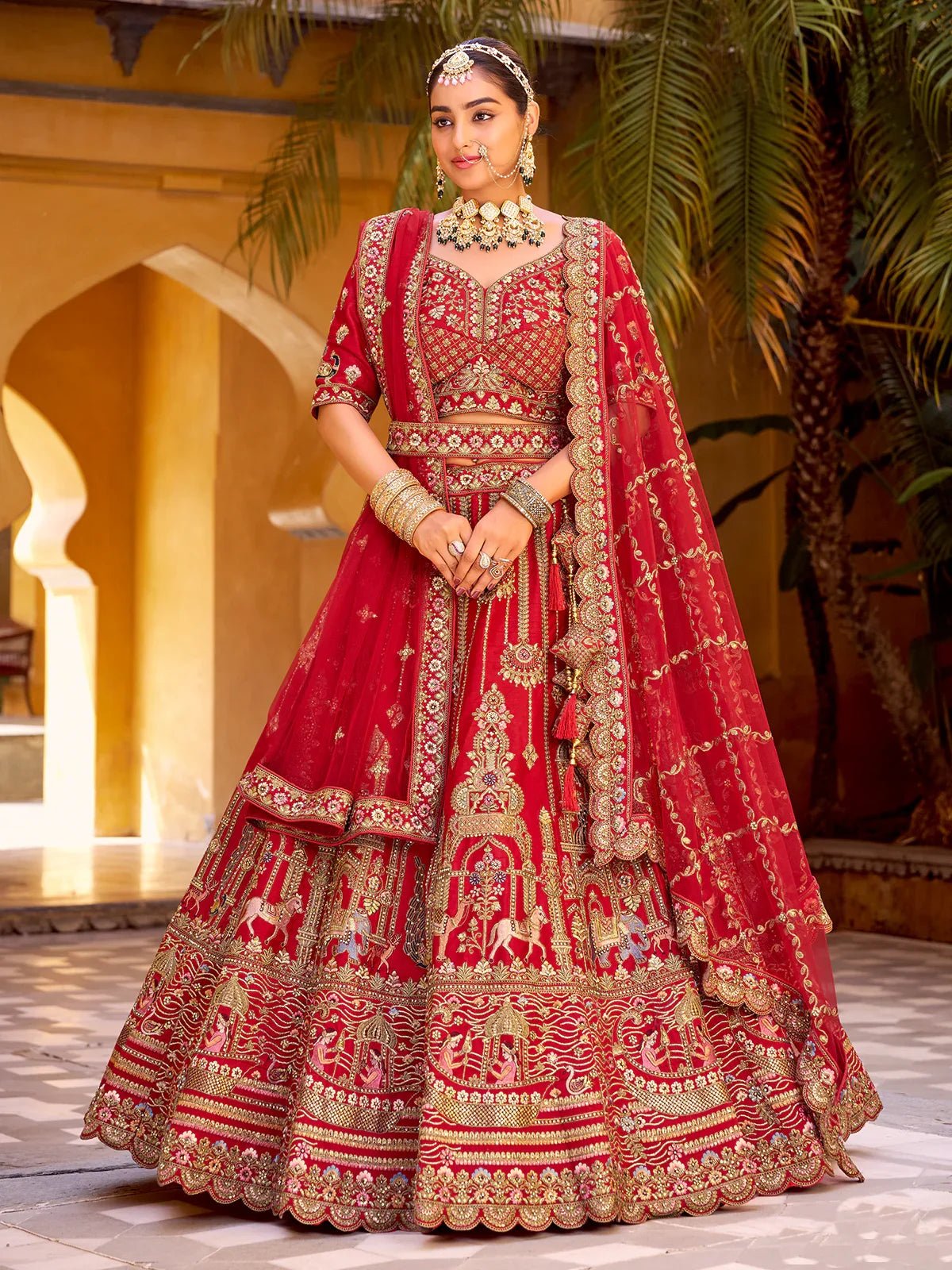 Lehenga: Premium SilkColor: RedBlouse: Premium SilkWork: Mirror Handwork, Zarkan Diamond, Multi EmbroidDupatta: Premium NetOccasion: Wedding WearLehenga length: Flair: 5MTR, Waist upt 44 inch, length upto: 42 Inch