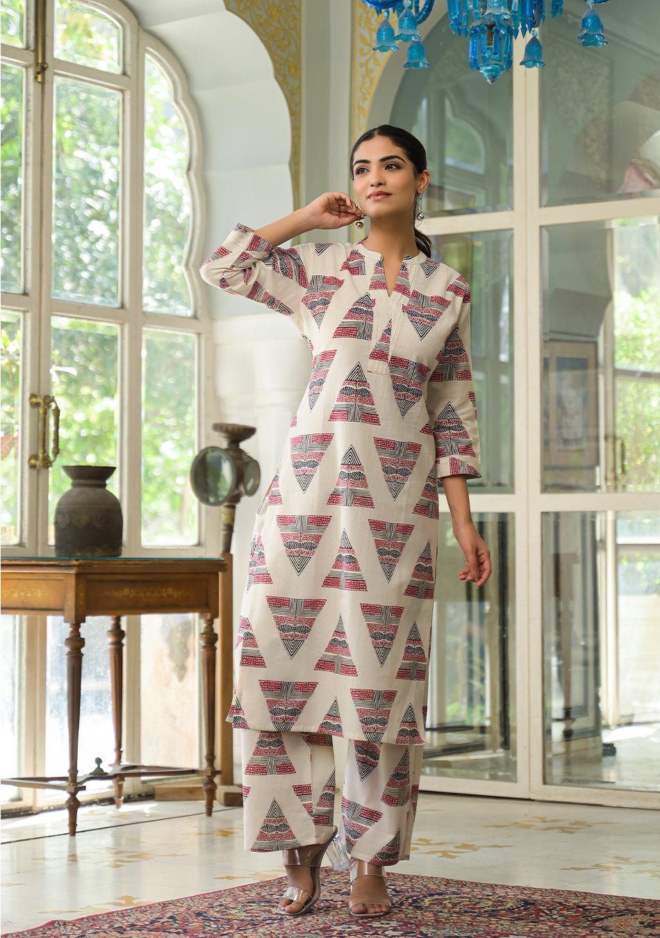 Color: creamNeck type: round neckPrints & patterns: geometric tribal printHemline: A-lineSleeve: 3/4th sleevesOccasion: casualFabric purity: pureSleeve type: attached sleevesCare instruction: recommended ? hand washSlit detail: multi slitsKurta length: knee lengthBase design: tribalTop shape: A-lineTop fabric: flexBy type: kurta setsBottom fabric: flexBottom type: pantBottom pattern: geometric tribal print